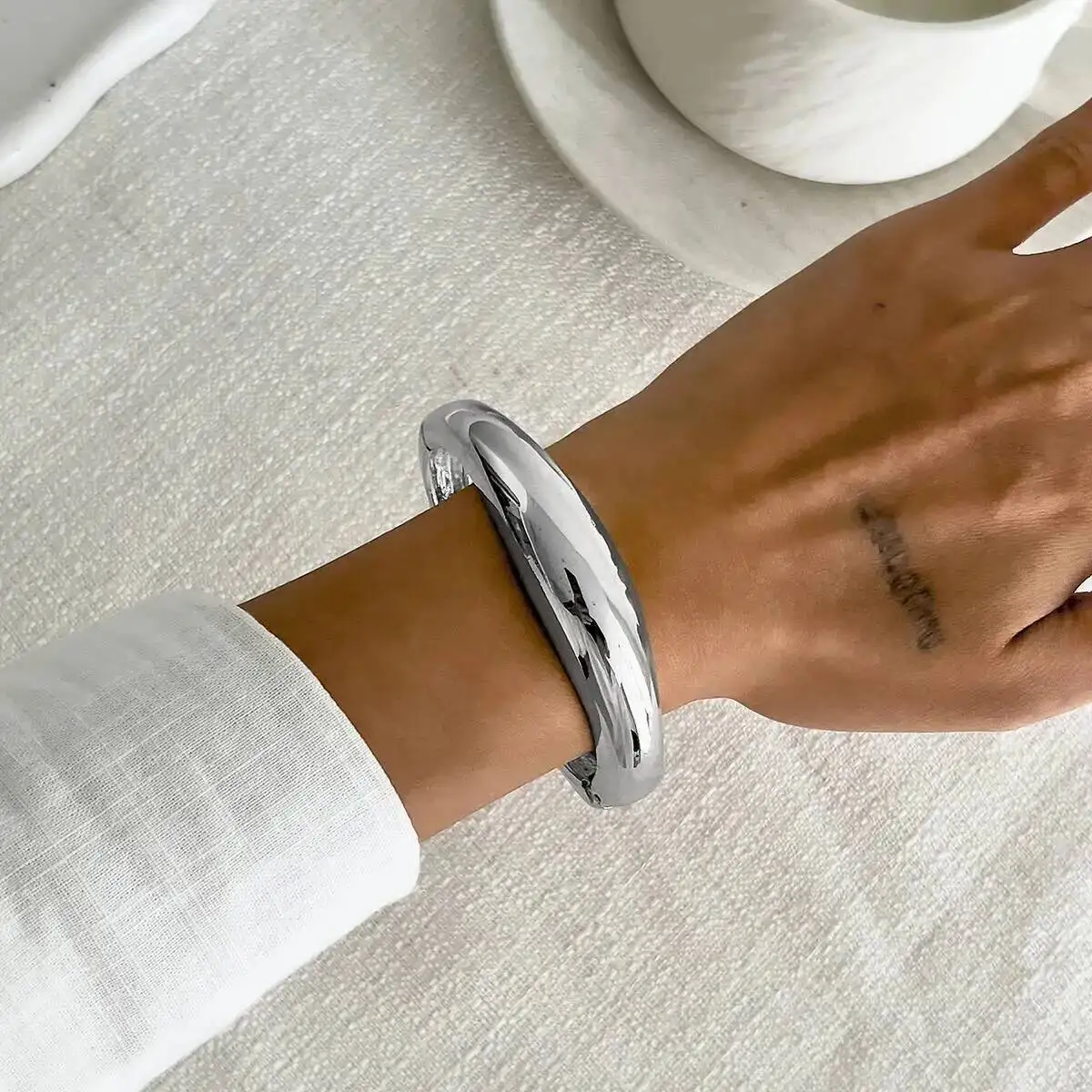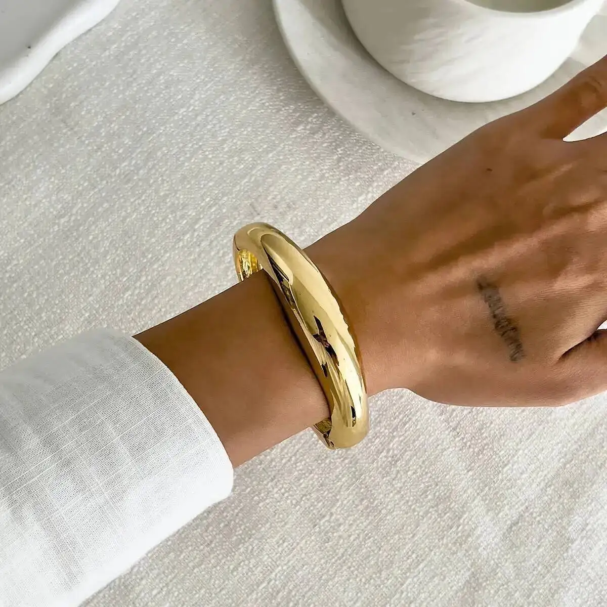The glossy wide cuff bangle adds a touch of elegance to any outfit, making it a versatile accessory for various occasions.
