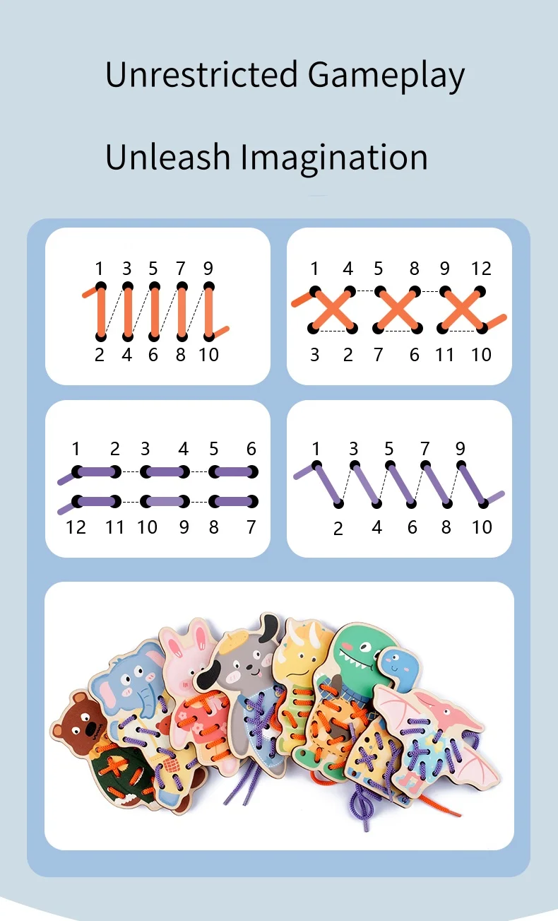 Encourages Patience and Creativity: Lacing involves repetitive and focused actions, which naturally promote patience and concentration. As children experiment with creating different patterns and designs, their creativity and imagination are ignited, encouraging them to explore endless possibilities and express themselves through play.